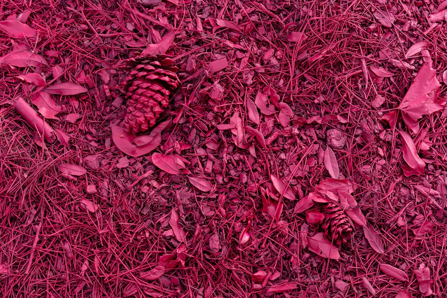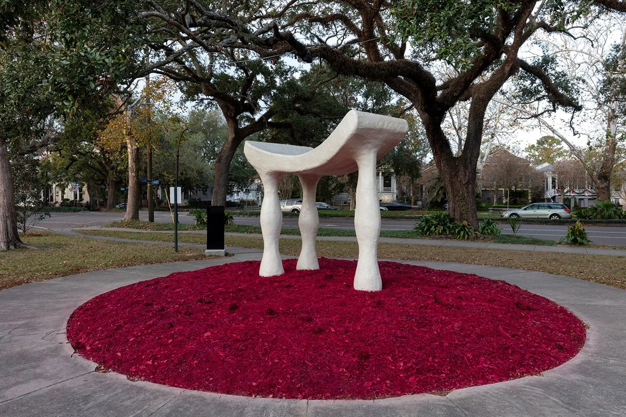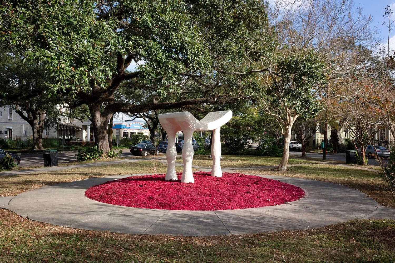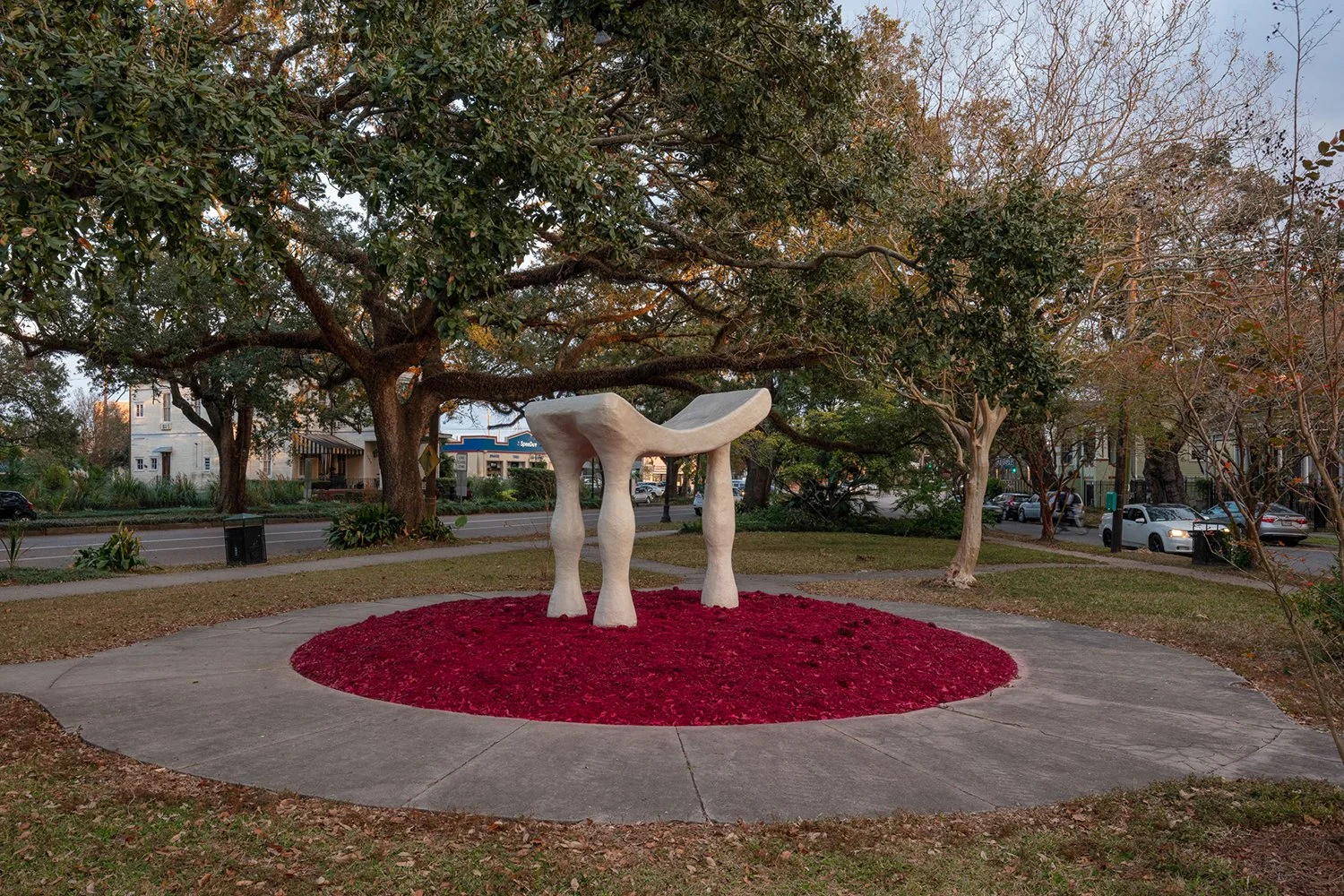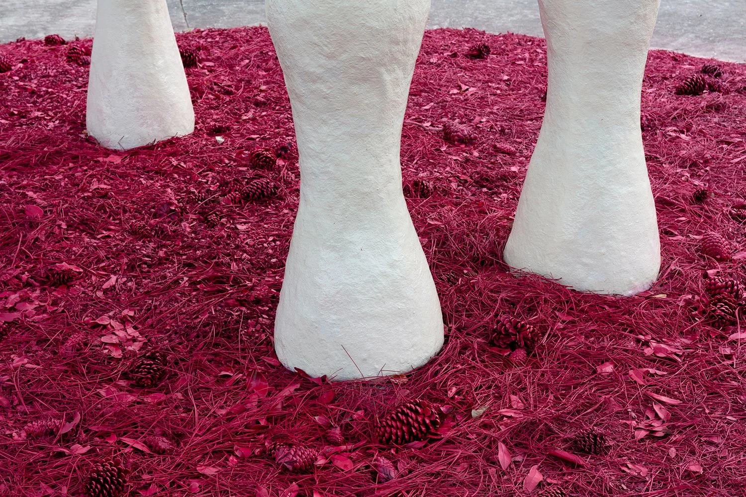 2021Fiberglass, polyester resin, steel, concrete, pine bark, bay leaf, water based paint, soundscape, scentsculpture :: 88 x 92 x 53 inchesland painting :: 264 inches diameter