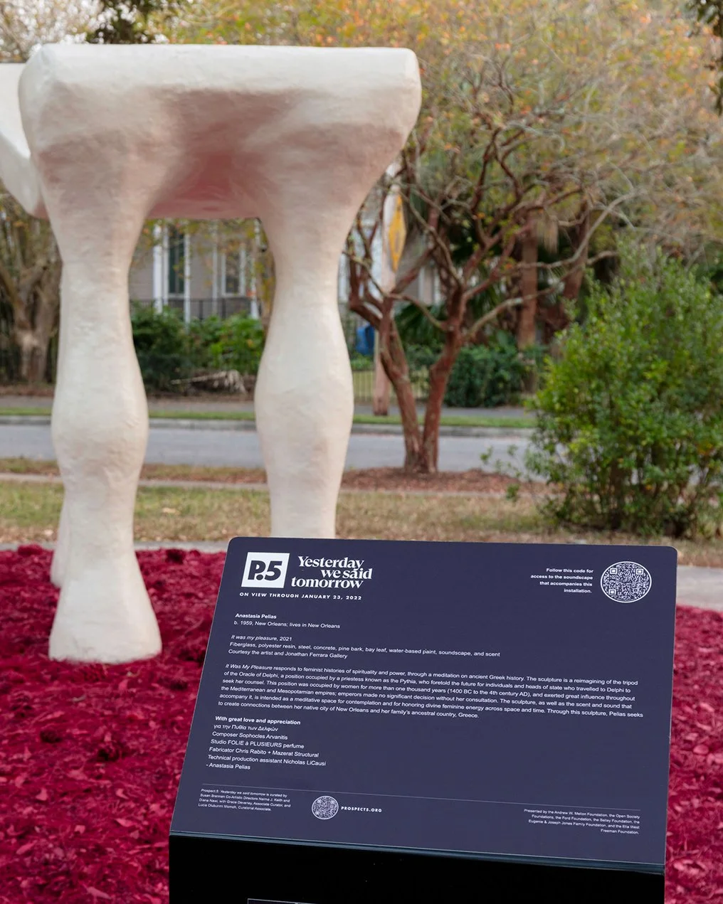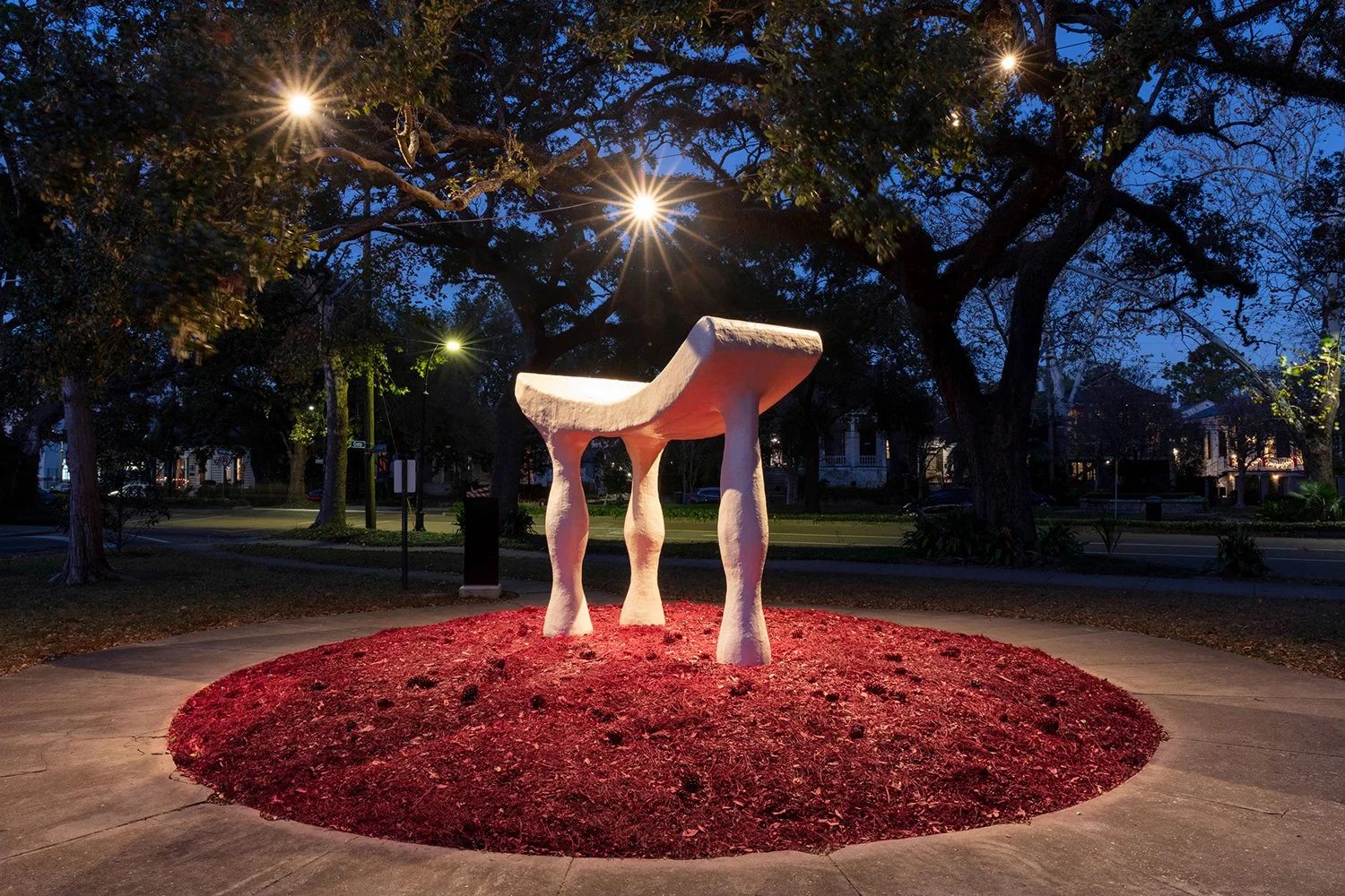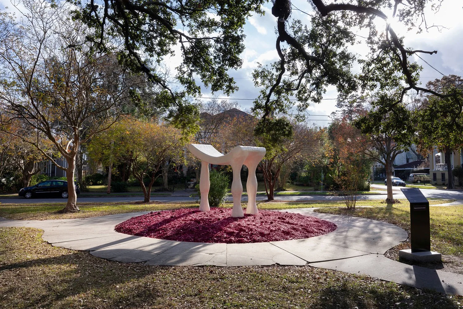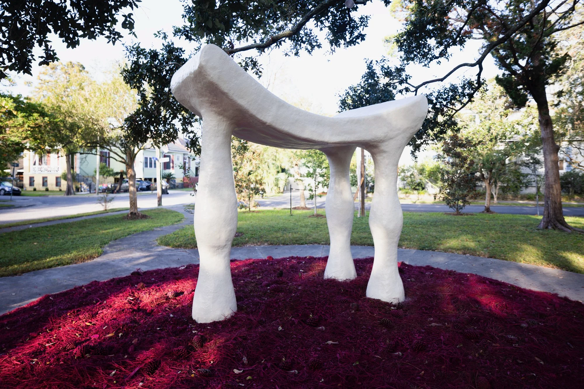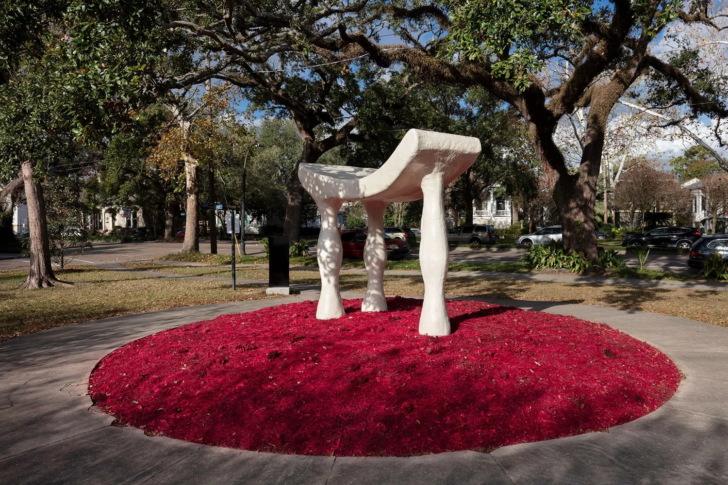 2021Fiberglass, polyester resin, steel, concrete, pine bark, bay leaf, water based paint, soundscape, scentsculpture :: 88 x 92 x 53 inchesland painting :: 264 inches diameter